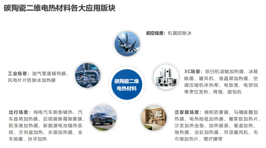泛家居领域,在除雾卫浴镜、智能马桶、电热地毯等产品上应用,以二维发热技术实现整面均匀加热与超长寿命,重塑健康家居体验;