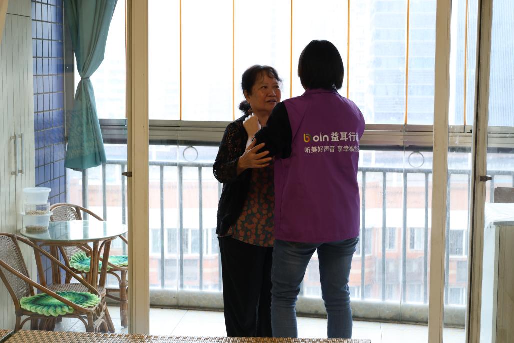 门铃响了又响,在卧室里的婆婆依稀听到响动,起身开门,见到冒雨前来的博音听力志愿者团队时,既惊讶又惊喜:“你们真的来了!”