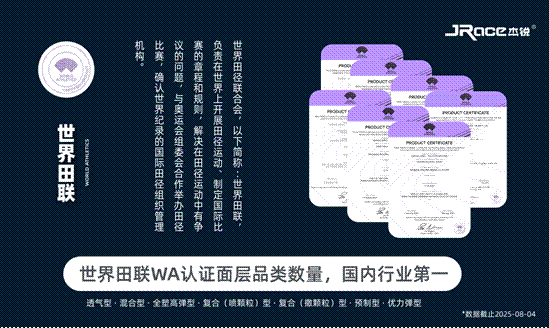 能够成为十五运主场馆的材料供应商,杰锐体育的实力早已得到充分印证。作为赛事级场地材料供应商,杰锐多款产品获得世界田联与中国田协双认证。截至2025年5月,杰锐体育共有七款塑胶跑道产品获得世界田联认证,数量居国内行业之首;四款塑胶跑道通过了中国田协面层审定,其中混合、全塑型更是行业首家通过A级审定。不仅在跑道领域,杰锐体育还是行业首家现浇型聚氨酯球场材料获FIBA室内二级、室内一/二级认证的企业,并先后参与坦桑尼亚国家体育场、哈萨克斯坦奥林匹克运动中心、蒙古田径及水上运动中心、昆明市体育中心、中山大学、华南农业大学等多个国内外大型体育场馆项目建设,产生多个WA世界田联、中国田协等标杆场地案例。