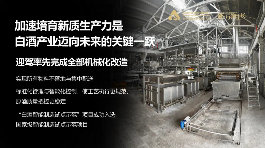 迎驾深知,在智能制造成为国家战略主攻方向的今天,加速培育新质生产力,实施技改升级、设备更新、工艺优化、数字赋能,是白酒产业迈向未来的关键一跃。我们深入研究传统酿酒工艺,按照酿酒过程属于间隙性的客观规律,不断创新,在全国白酒行业率先完成了全部机械化改造,实现了粮、糟、糠、曲所有物料不落地,推行粮、糠、曲、水、汽的集中配送,进行标准化管理、智能化控制,使工艺执行更规范、原酒质量把控更稳定。公司“白酒智能制造试点示范”项目成功入选国家级智能制造试点示范项目。