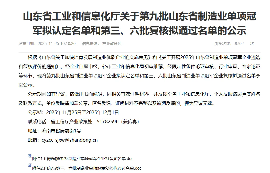 2025年11月25日,山东省工业和信息化厅公示第九批制造业单项冠军拟认定名单,山东金信空调集团股份有限公司凭借大风量纺织轴流风机核心技术强势登榜,成为省内纺织空调装备领域唯一入选企业。