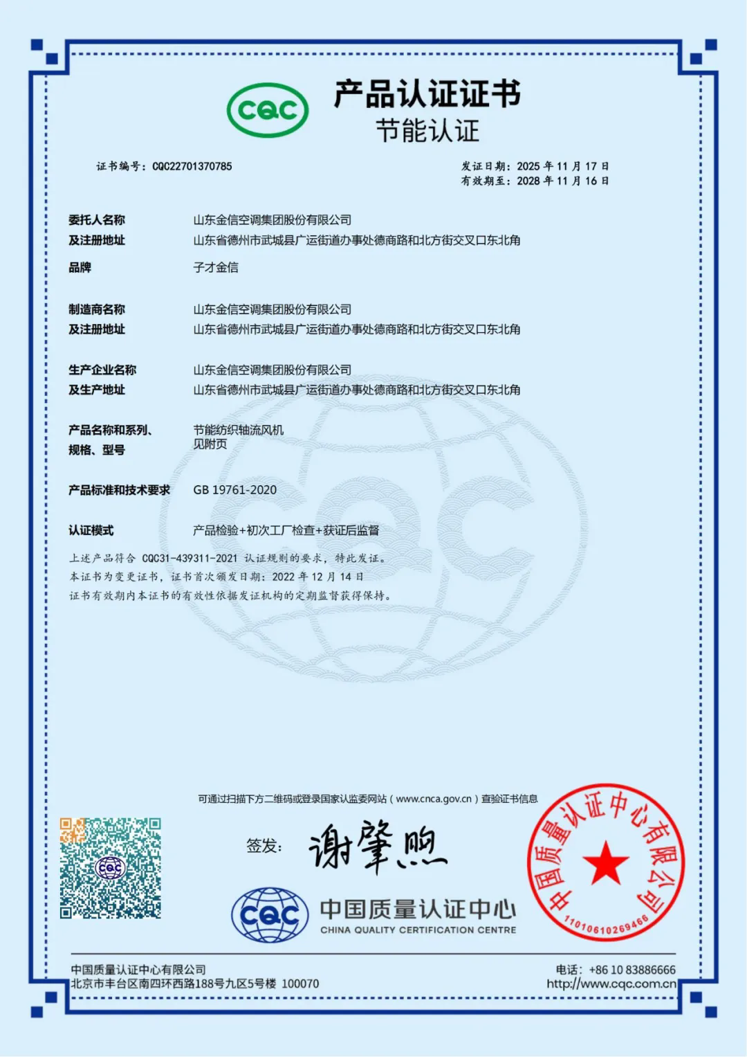 目前,该风机已获国家一级能效标识及节能产品认证,国内市场占有率突破20%。 该系列产品获得一级能效,并获得中国质量检测中心节能产品认证。