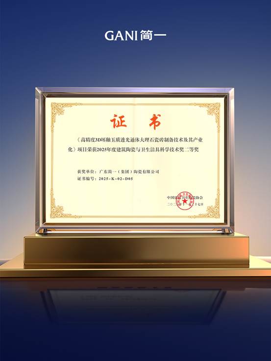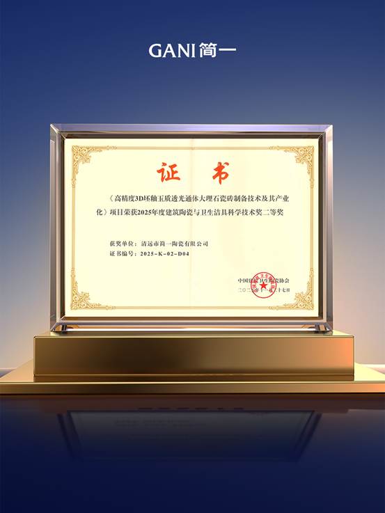 在科学技术类奖项中,清远市简一陶瓷有限公司与广东简一 (集团) 陶瓷有限公司联合申报的“高精度3D坯釉玉质透光通体大理石瓷砖制备技术及其产业化”项目,荣获 “建筑陶瓷与卫生洁具科学技术奖 - 二等奖”。该项目已通过权威科技成果鉴定,鉴定委员会认为其整体技术达到国际先进水平,其中高白度玉质透光制备技术更达到国际领先水平。项目凭借以下三大核心技术实现关键突破::
