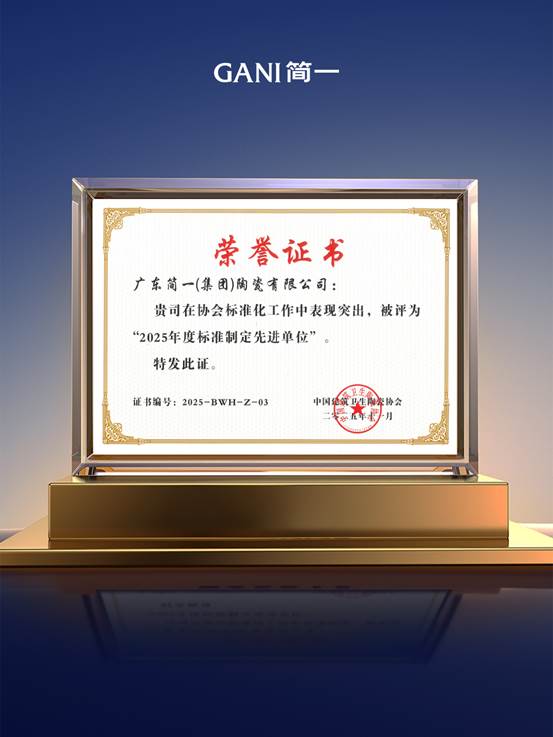 广东简一(集团)陶瓷有限公司获得“2025年中国建筑卫生陶瓷协会标准化工作先进单位”荣誉证书