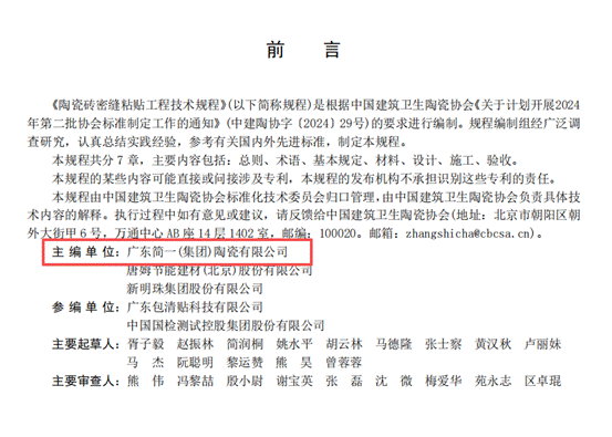 “2025年中国建筑卫生陶瓷协会标准化工作先进单位”荣誉的获得,源于简一积极参与行业标准参编的责任担当。作为行业头部品牌,简一深度参与中国建筑卫生陶瓷协会组织的标准建设工作,主导起草《陶瓷砖密缝粘贴工程技术规程》等团体标准,明确密缝铺贴分级指标与技术要求,为规范行业服务、破解消费痛点提供了科学依据,推动行业从“产品制造”到“服务制造”的升级转型。