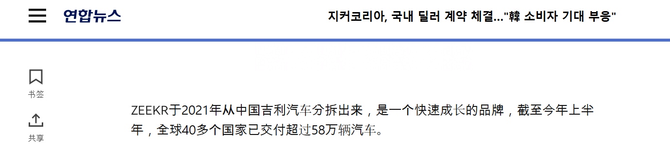韩国媒体对极氪进入韩国市场给予高度关注。多家媒体报道均表示,中国汽车品牌正在加速登陆韩国,极氪作为高端豪华品牌,将形成从4000万韩元到一亿韩元的价格区间。