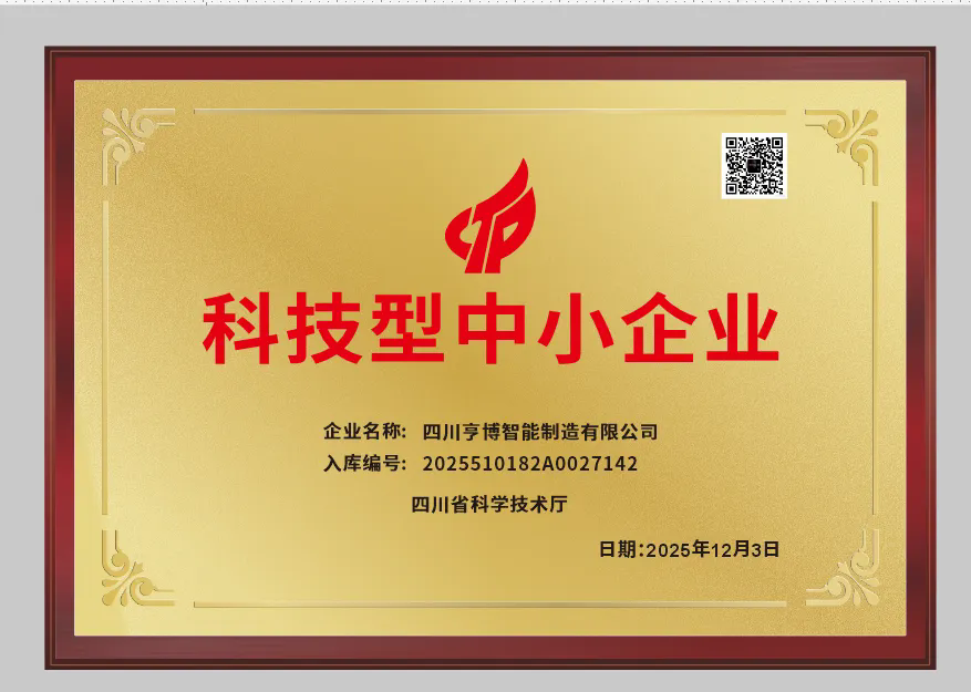 这张金色牌匾不仅是荣誉的象征,更是一份官方“认证”。它标志着四川亨博智能制造有限公司在科技创新能力、研发投入、成果转化等方面符合官方认定标准,正式成为重点培育与支持的科技型创新主体。