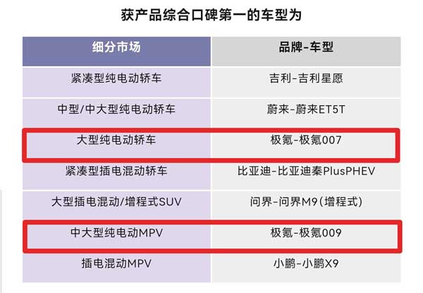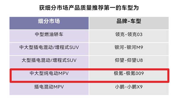 近日,国际汽车质量标准化协会(IAQSA®)联合中国汽车推荐度研究工作组,首次发布中国汽车推荐度研究(NPS)结果,极氪品牌两款车型在多维度严选中表现突出,夺得多个细分市场榜首:极氪009荣获“中大型纯电动MPV”产品质量推荐第一和产品综合口碑第一两项荣誉,极氪007在“大型纯电动轿车”市场斩获产品综合口碑第一。