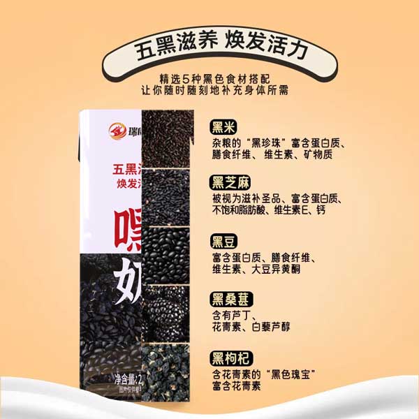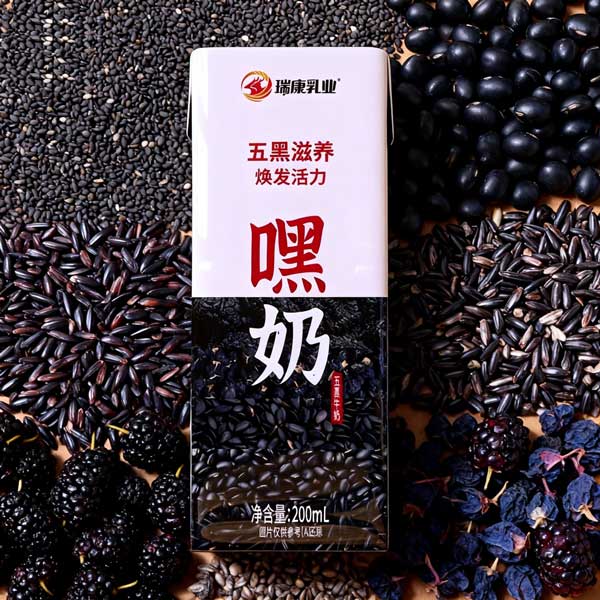 瑞康精选5种黑色食材科学搭配出新中式营养配方,经过上百次配比试验,将五黑精华与优质牛奶完美融合,创造出口感细腻顺滑、香气层次丰富的创新乳品——“嘿奶”五黑牛奶。
