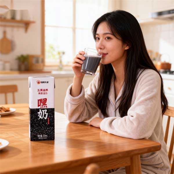 瑞康“嘿奶”五黑牛奶的配方背后,是对传统食养文化的深度挖掘与现代营养科学的严谨验证。黑芝麻被视为滋补圣品,富含蛋白质、不饱和脂肪酸、维生素E、钙;黑豆提供优质植物蛋白、膳食纤维与异黄酮;黑米则是杂粮的“黑珍珠”,富含蛋白质、膳食纤维、矿物质等;黑桑葚含有芦丁、花青素等;黑枸杞则是天然的花青素宝库。