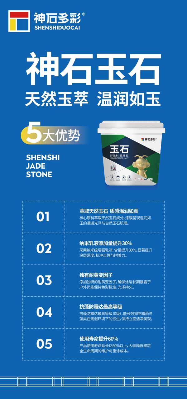 作为本次大会的亮点新品,神石玉石漆萃取天然玉石为核心原料,融合高品质纳米级乳液精制而成。产品自带温润如玉的细腻质感与通透光泽,既能为建筑外墙赋予高端典雅的东方雅韵,更兼具抗藻防霉、强效抗污、耐候耐用的优异性能,完美平衡美学价值与实用属性,为外墙装修提供了更高端的新选择。