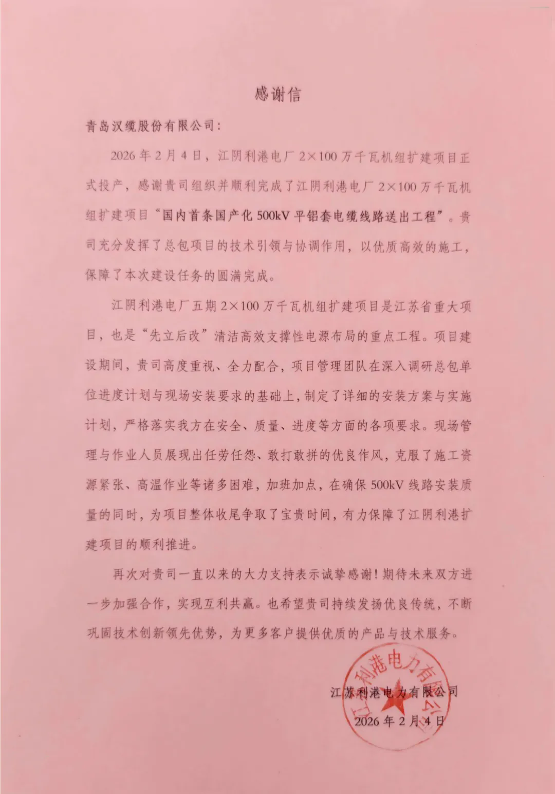 近日,青岛汉缆股份有限公司(股票代码:002498.SZ,以下简称:汉缆股份)收到江苏利港电力有限公司发来的感谢信,信中对由汉缆股份承建的“国内首条国产化500kV平铝套电缆线路送出工程”给予高度评价。该工程已在江苏省装机规模最大的火电厂——江苏江阴利港电厂五期2×100万千瓦机组扩建项目中成功投运。