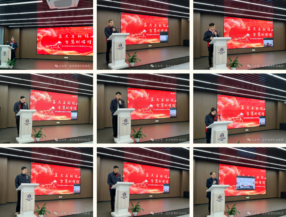 3月3日上午,蓝天智慧科技集团有限公司隆重举行2026年新春动员大会。全体行政管理人员、车间组长及以上管理人员现场参会,舒衣雅蓝天相关负责人通过视频连线“云端”相聚,共同开启新一年的奋斗篇章。