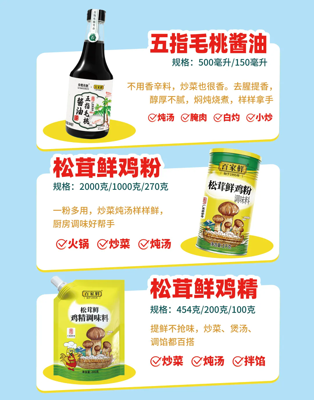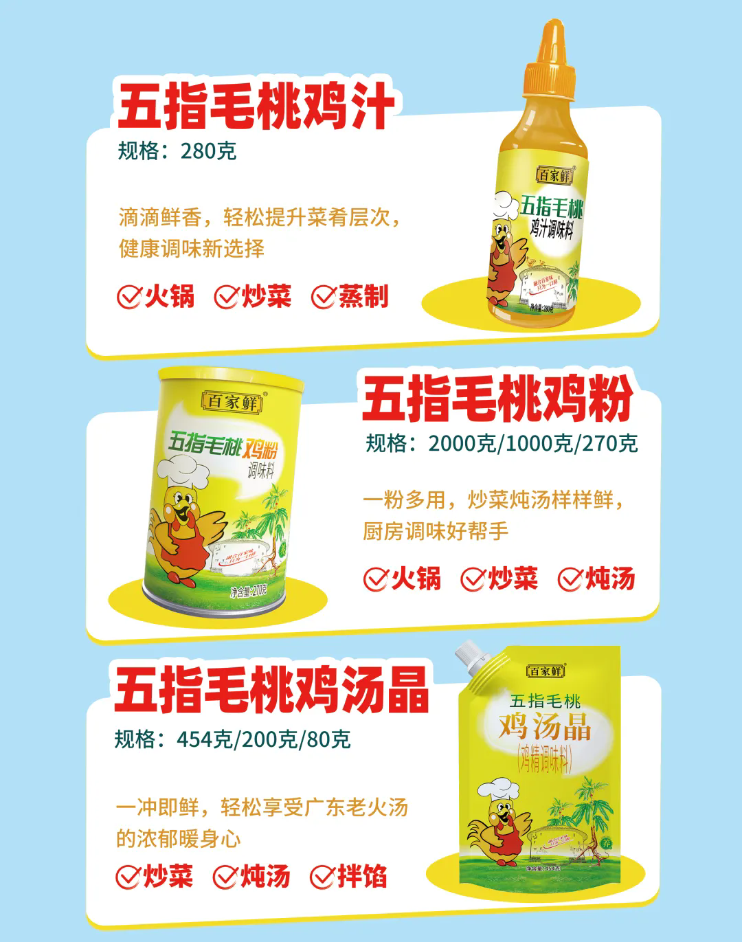 核心产品线覆盖十大系列 300 余种复合调味品;聚焦 “复合调味 + 大健康 + 药食同源”,推出五指毛桃酱油、五指毛桃鸡粉等特色产品,采用超临界萃取技术保留食材营养风味。