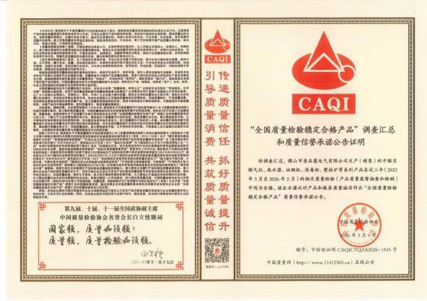 中国质量检验协会作为全国性质量专业社团组织,主管部门为国家市场监管总局,一直致力于助力广大企业抓好质量提升,引领社会各界共筑质量诚信、关注质量安全,传递质量信任、引导质量消费,是全国质量领域具有公信力的质量检验行业组织。中燃宝荣获的四项质量信誉公告,不仅是一份荣誉,更是中燃宝向千万家庭交出的“质量答卷”,每一项都直指质量核心:中燃宝产品在长期质量检验中表现稳定,在2023至2026年期间的产品质量国家监督抽查中均没有任何情况的不合格记录,连续三年符合国家及行业标准,是产品可靠性与安全性的直接证明;中燃宝在产品质量与服务诚信上的双重承诺,从生产到售后,全链路坚守诚信经营底线;中燃宝致力于打造安全燃气具领导品牌,在燃气具领域具有质量标杆地位,其技术实力与质量管控能力得到广大消费者的信赖和认可;中燃宝的质量诚信承诺通过第三方质量检验行业组织发布并接受监督,让每一位用户都能直观感受到品牌对品质的坚守,让消费者放心消费。