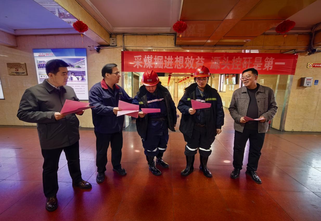 图为宣讲员在新景公司井口宣传,将“源头减矸”与“提高品种产率、提高末煤发热量、提高市场竞争力”贯穿全年生产经营始终,做好全年煤质管控工作。