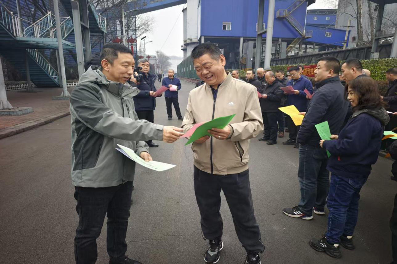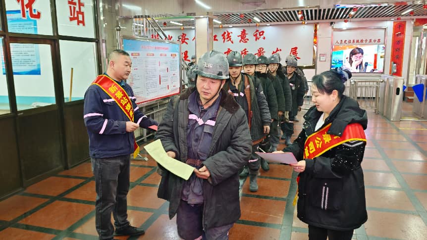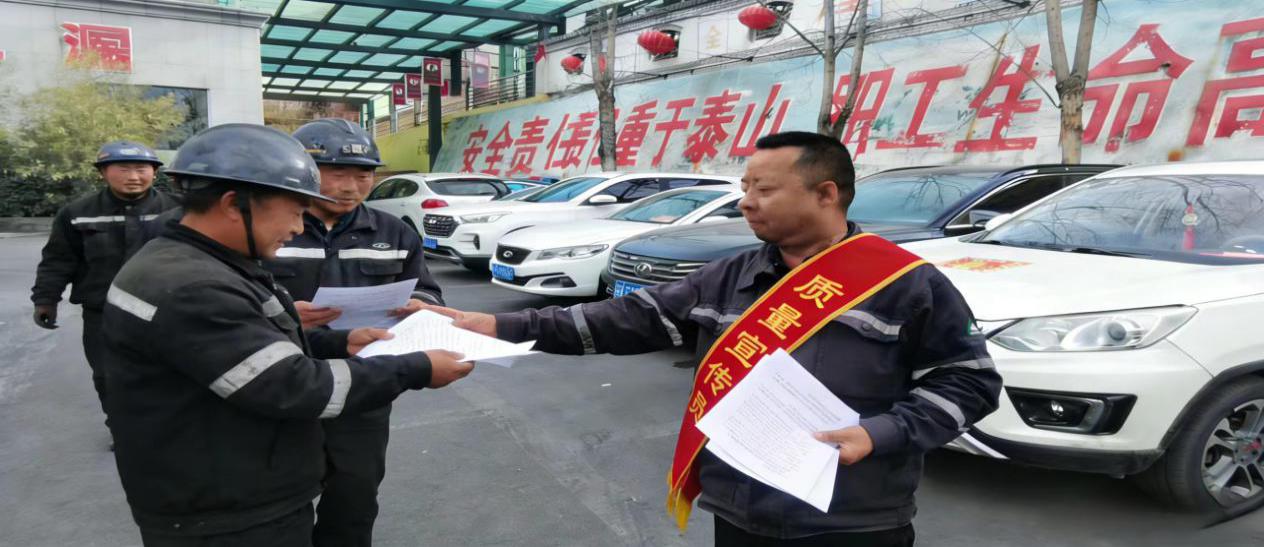 图为二矿站组织骨干人员深入二矿井口,向一线作业人员发放宣传材料开展煤炭质量宣传、面对面讲解煤炭质量标准、提质增效要求及质量对企业效益、客户信任的重要意义,引导生产一线员工从源头重视煤质。