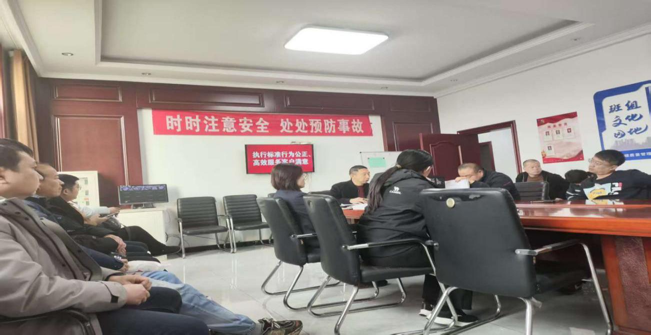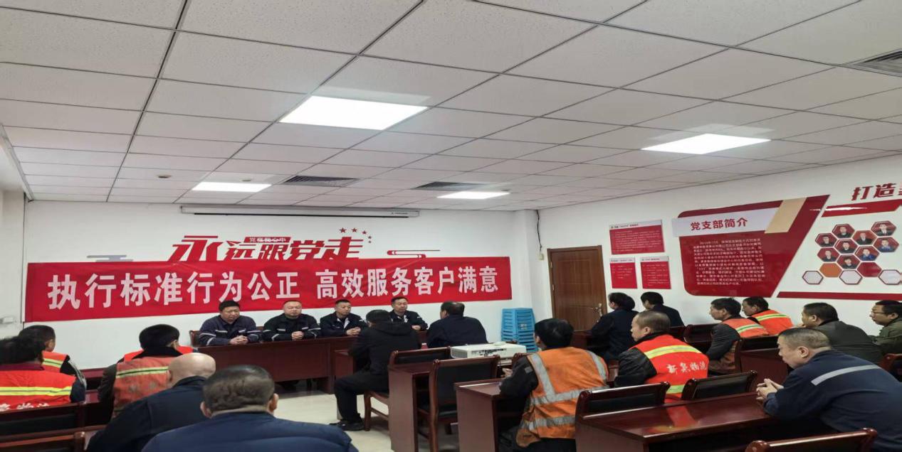 图为新景站组织开展以“执行标准行为公正、高效服务客户满意”为主题的市场形势宣讲并组织讨论。
