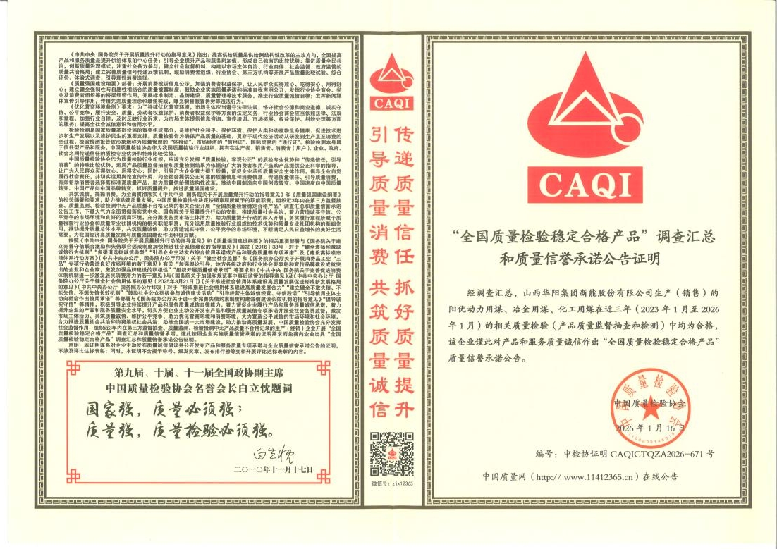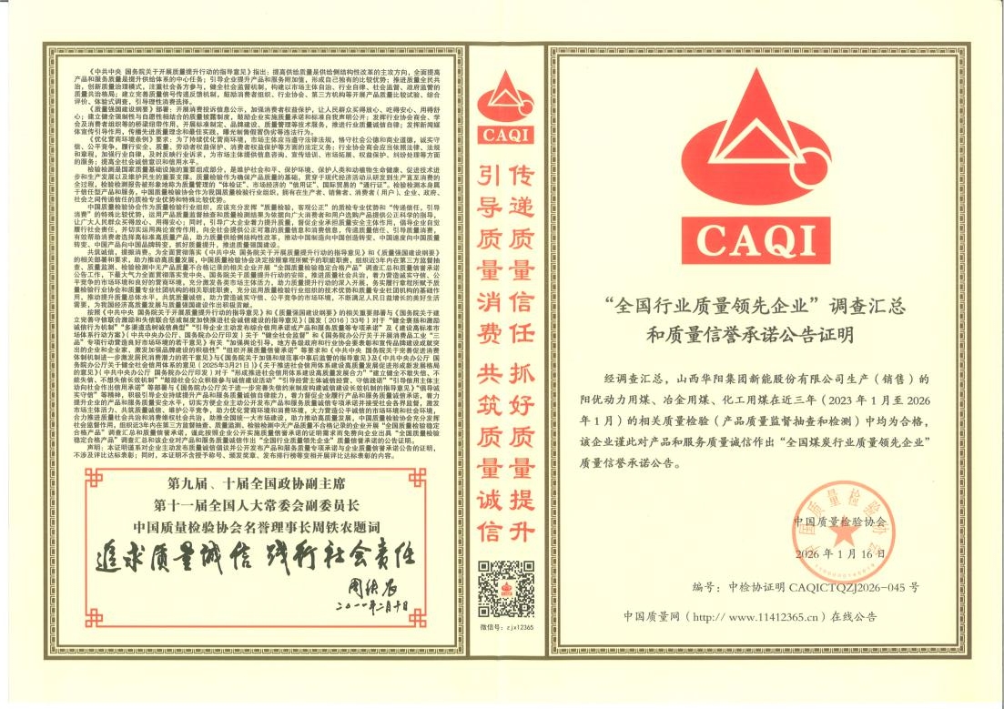 在中国质量检验协会组织的调查汇总公告中,“阳优”牌动力用煤、治金用煤、化工用煤同时荣获“全国行业质量领先企业”质量信誉承诺公告和“全国质量检验稳定合格产品”质量信誉承诺公告两项证明荣誉。