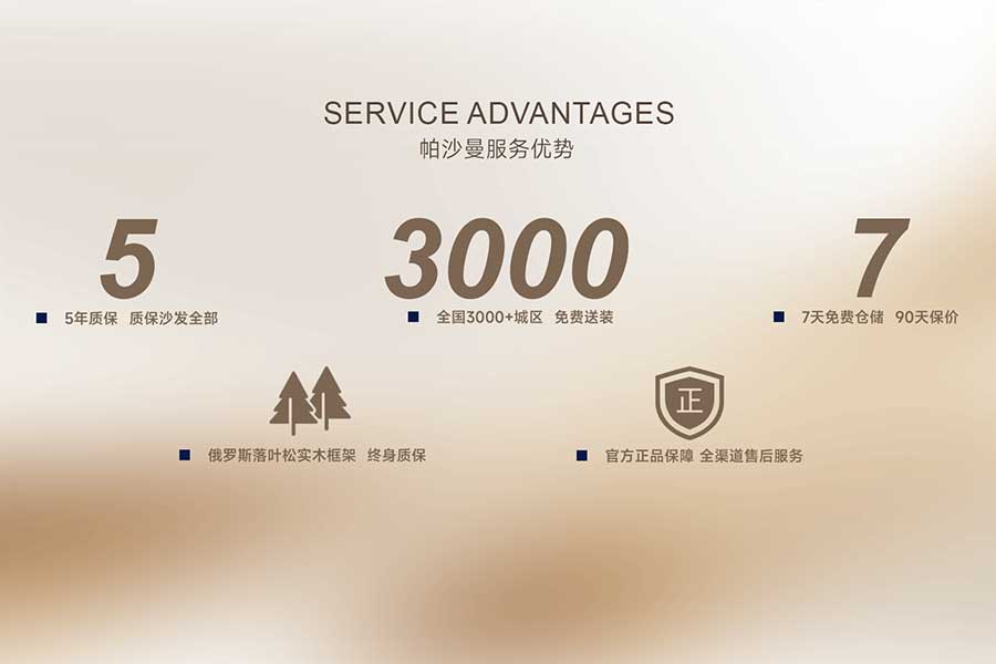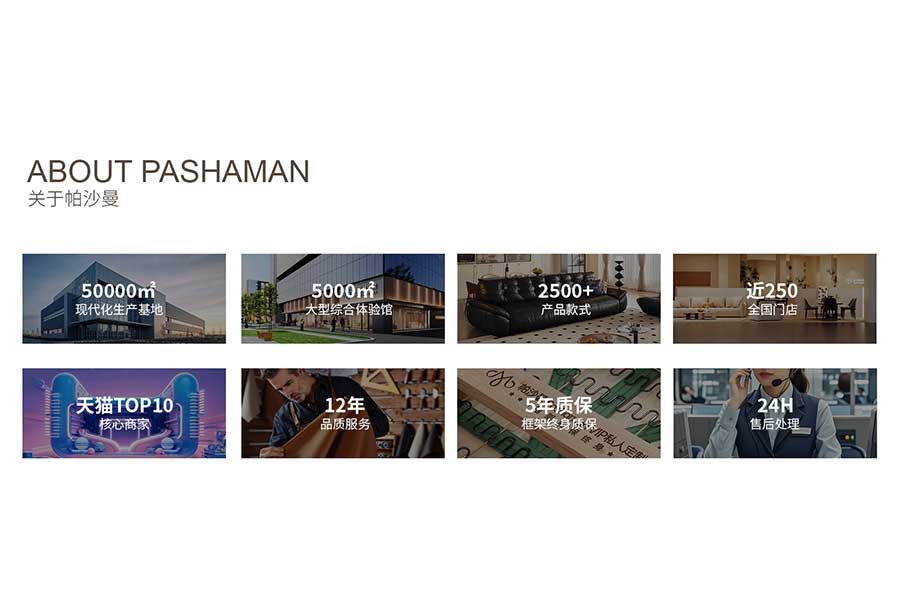 目前,帕沙曼拥有超50000平方米的现代化生产基地,全面采用精细化生产管理体系,荣获100多项国家专利及荣誉。帕沙曼承诺五年延长质保,在全国建立超5000+服务网点提供专业上门安装,并于华南地区打造超5000平方米的沉浸式综合体验馆,让美好生活触手可及。