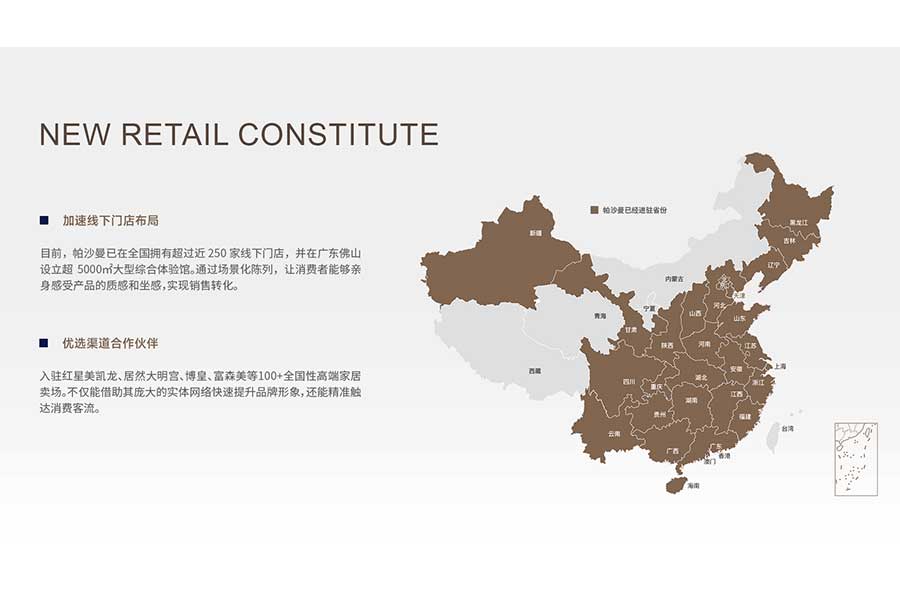 帕沙曼深度整合线上线下生态链,打造全平台多渠道的家居新零售模式,连续多年稳居天猫布艺沙发类目TOP1,成为天猫家装战略核心商家,以实力引领家居消费新风尚。