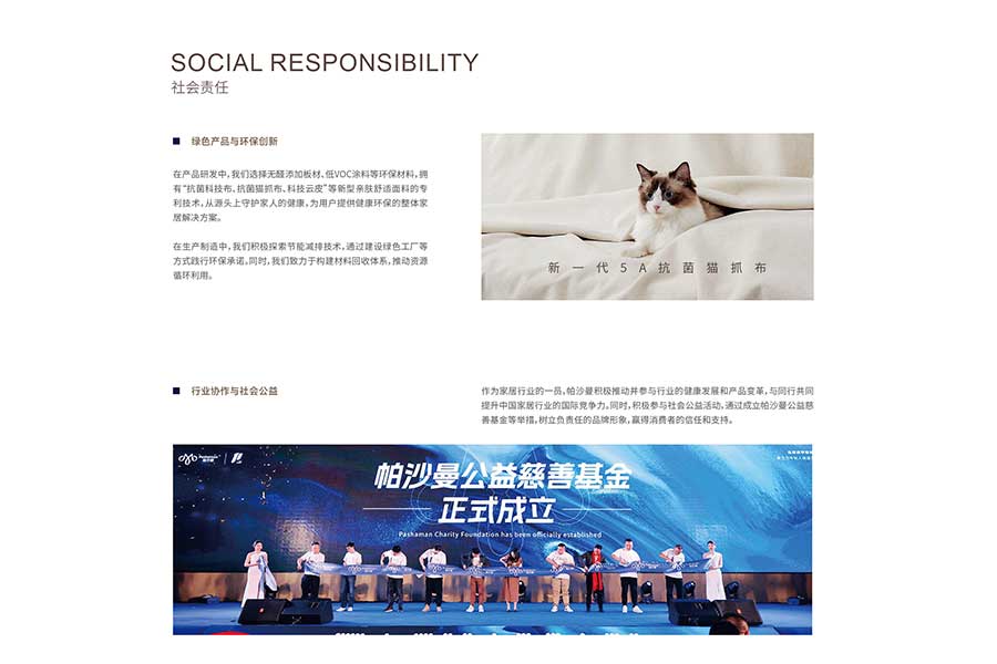在产品研发中,帕沙曼选择无醛添加板材、低VOC涂料等环保材料,拥有“抗菌科技布、抗菌猫抓布、科技云皮”等新型亲肤舒适面料的专利技术,从源头上守护家人的健康,为用户提供健康环保的整体家居解决方案。